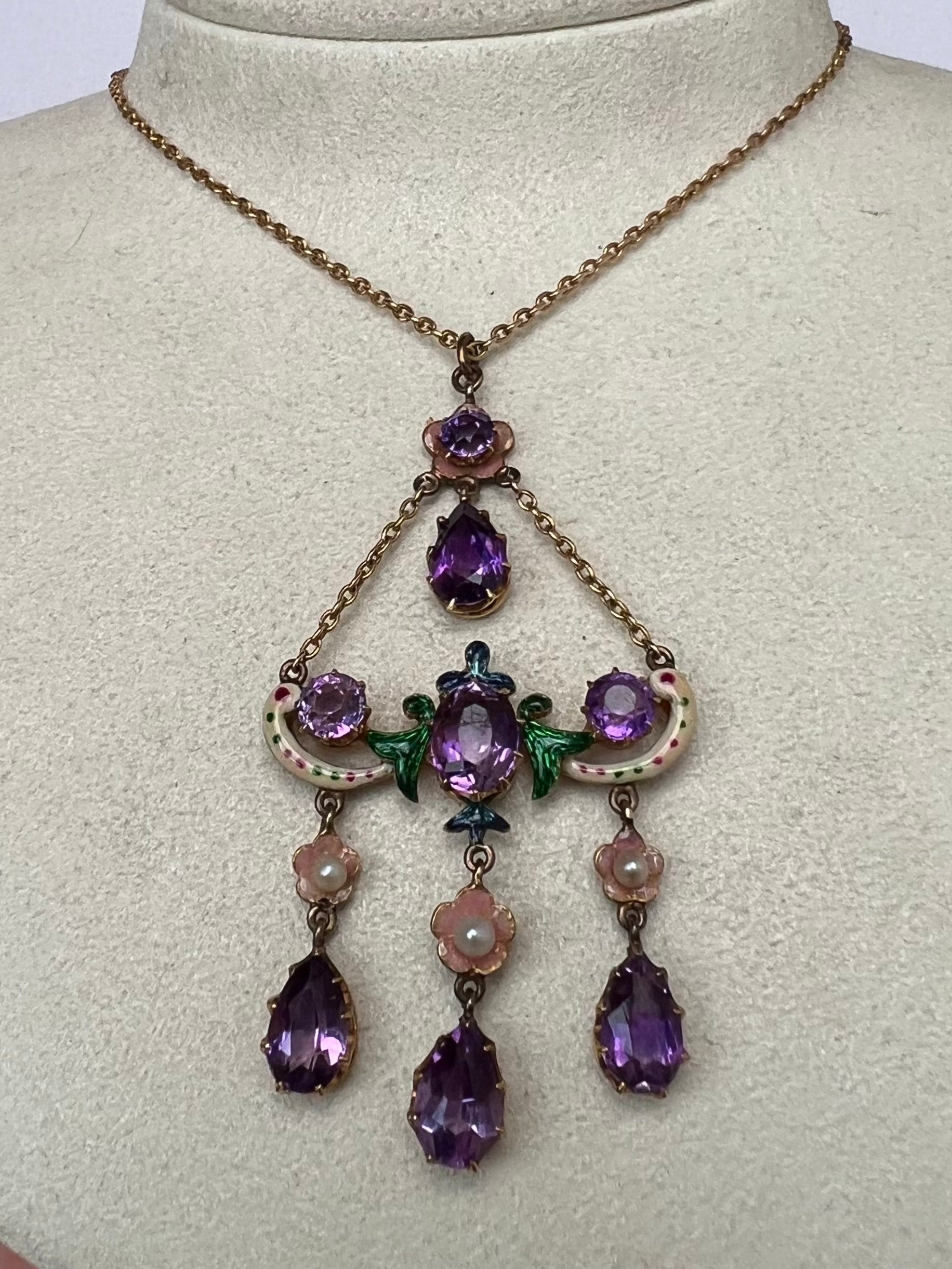 Sentimental Victorian 15ct Gold Amethyst Necklace in Suffragette Colours