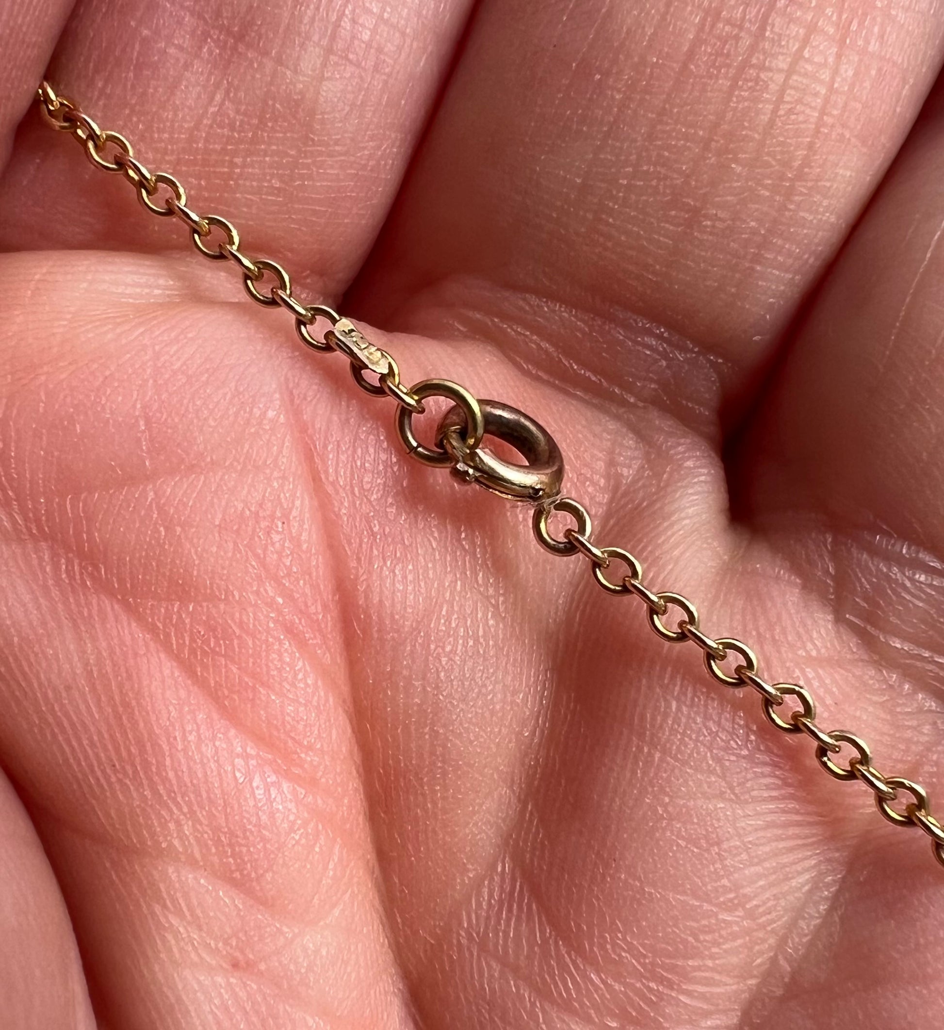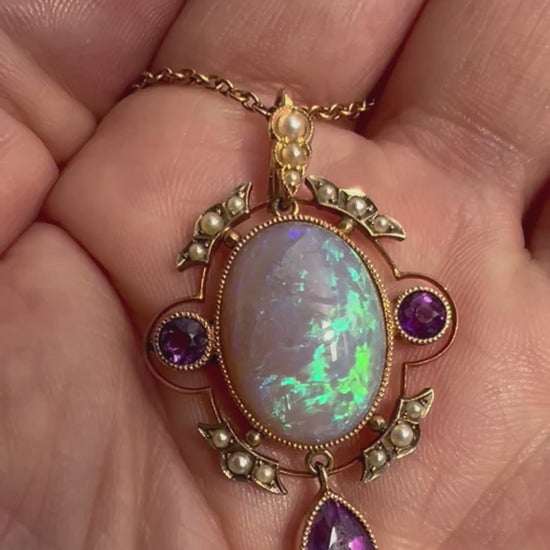Materials: Opal, gold (chain is 9ct with an antique 9ct stamp, pendant is gold, not yet tested for fineness, to follow), amethyst, seed pearl.