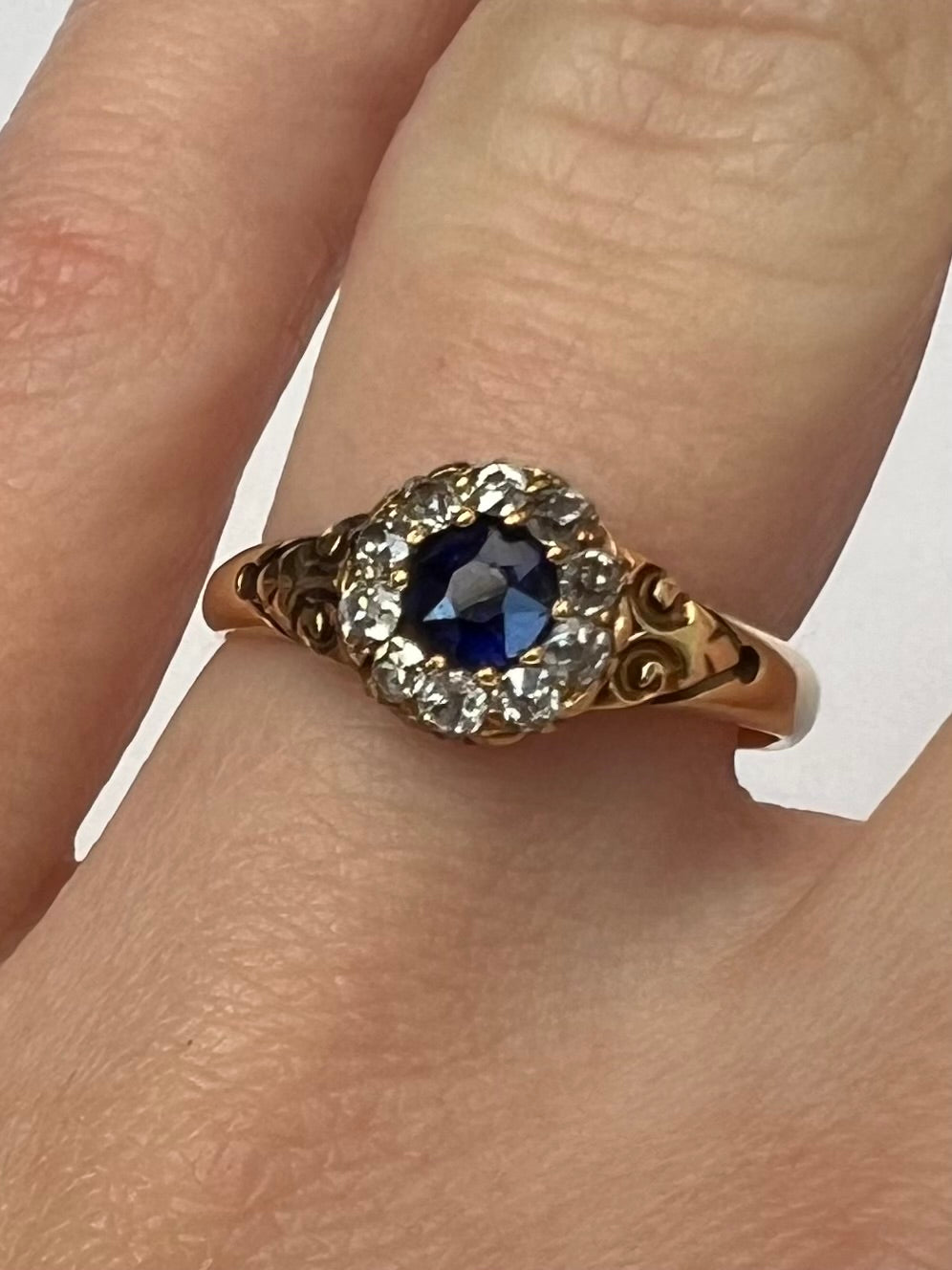 Description: Cute ring! The centre sapphire is a lovely rich blue colour and is a natural stone (beware, surprisingly, a lot of vintage and antique sapphires are actually synthetic, they've been able to make them in the lab since the 19th century). The diamonds are lovely twinkly old cuts, the shank has somelovwly hand engraving and it just all comes together to make a really pretty little ring.