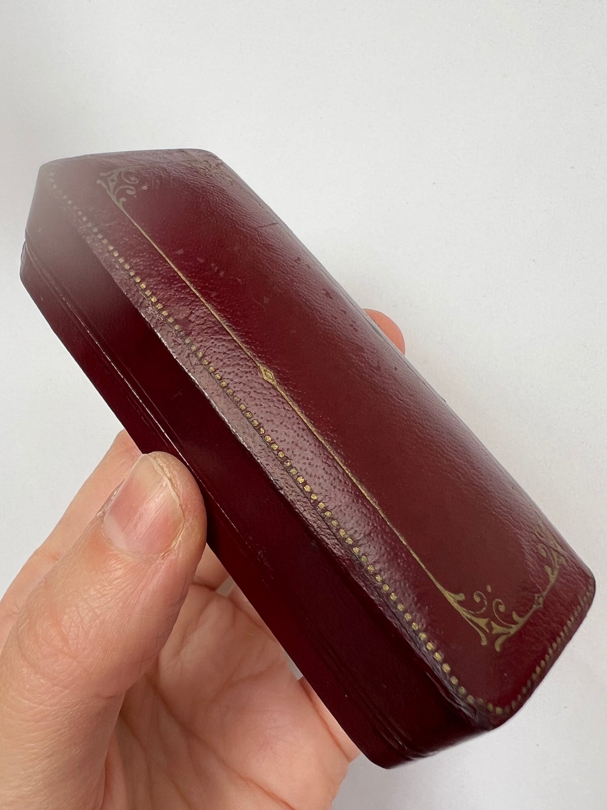 Materials: Banded agate or onyx, gold frame, base metal pin, leather box.