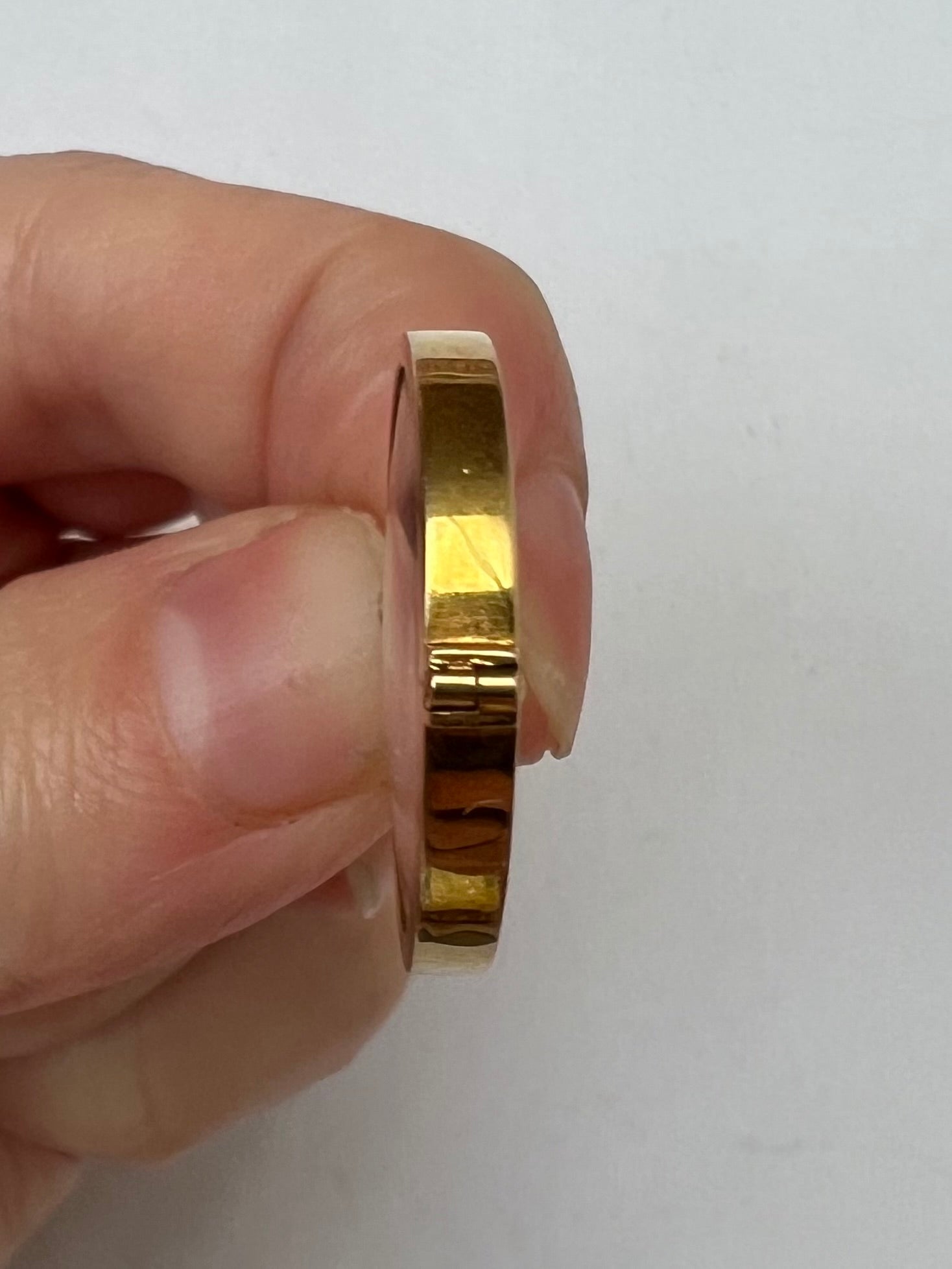 Description: A good addition to any jewellery box and unusual to see in 15ct gold. A lovely, clean example. The top screws off to release the 2 pieces of glass for you to display eg a photo of a loved one. There is not a whole load of space to play with inside so its probably not suitable for putting anything in that's thicker than a photo or two.