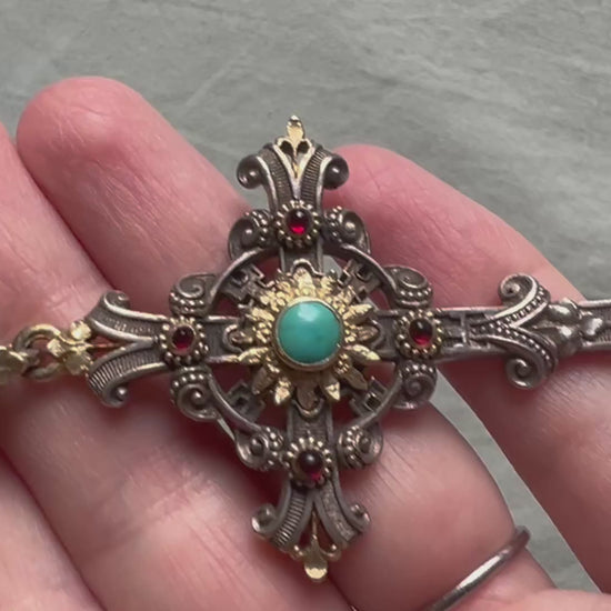 Materials: Silver and silver gilt, turquoise and paste. The section around the turquoise may be solid gold rather than gilt but we don't want to risk testing with acid so this is awaiting an x ray test, so assume for now all silver gilt.