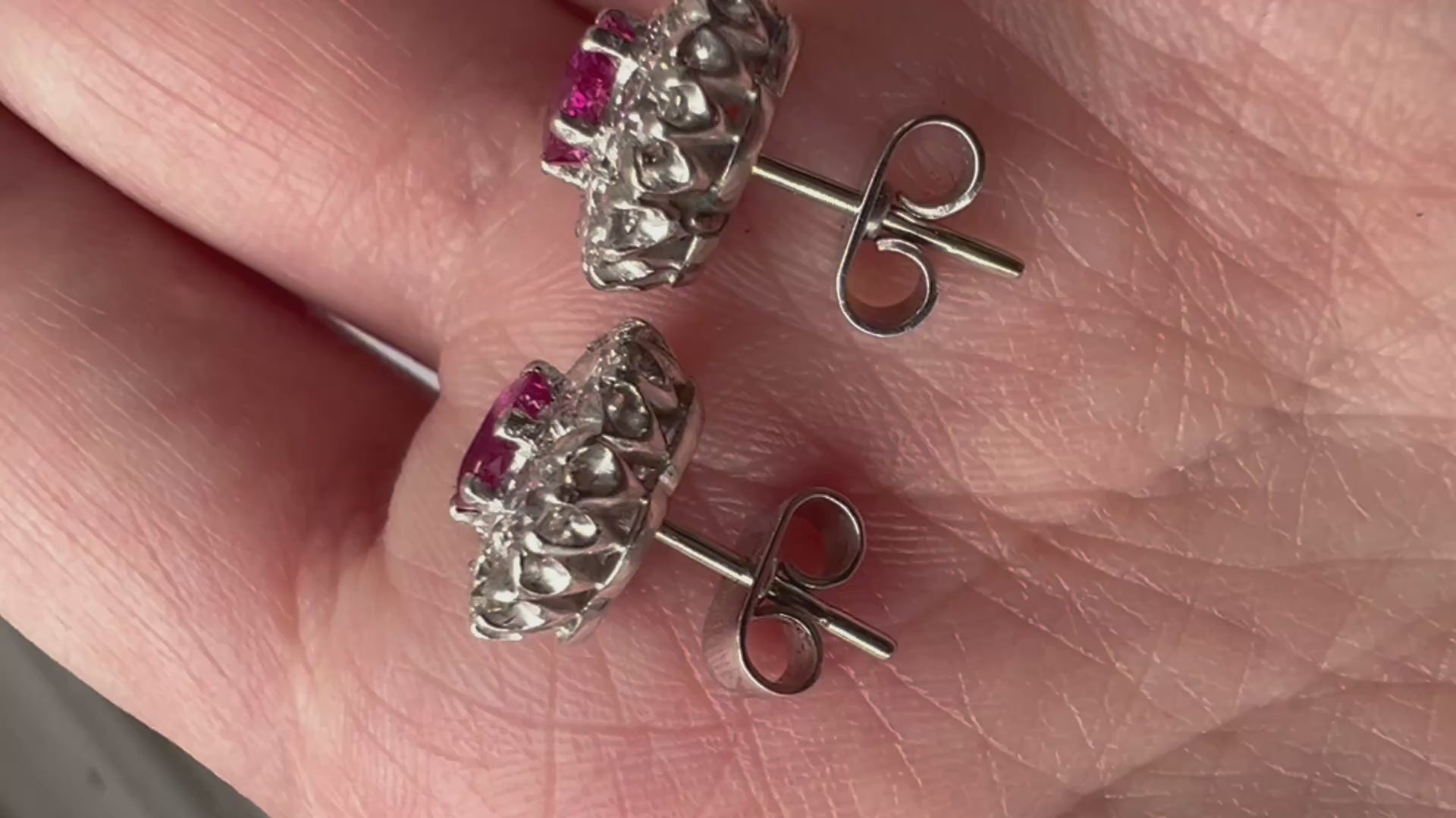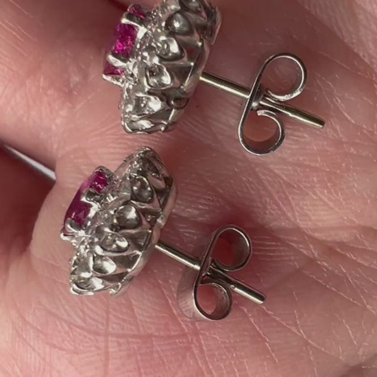 Late Art Deco 1950s Natural Ruby Diamond Daisy Cluster Stud Earrings, Boxed 18ct White Gold