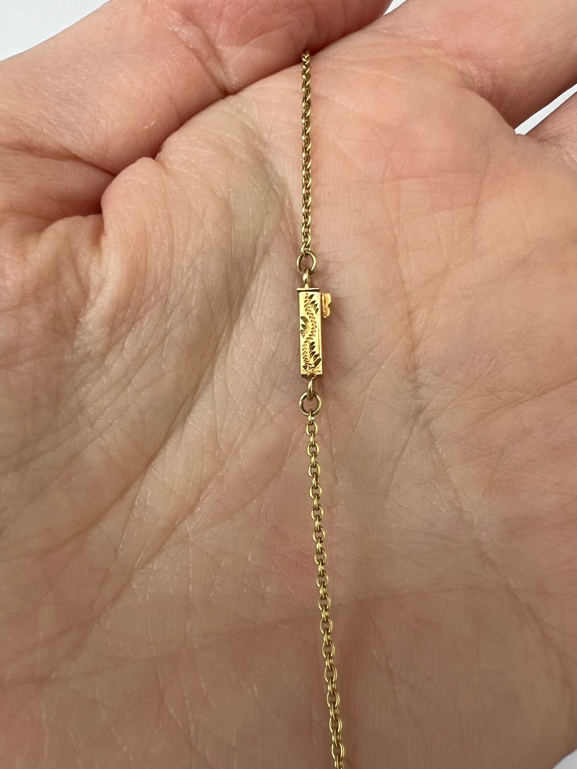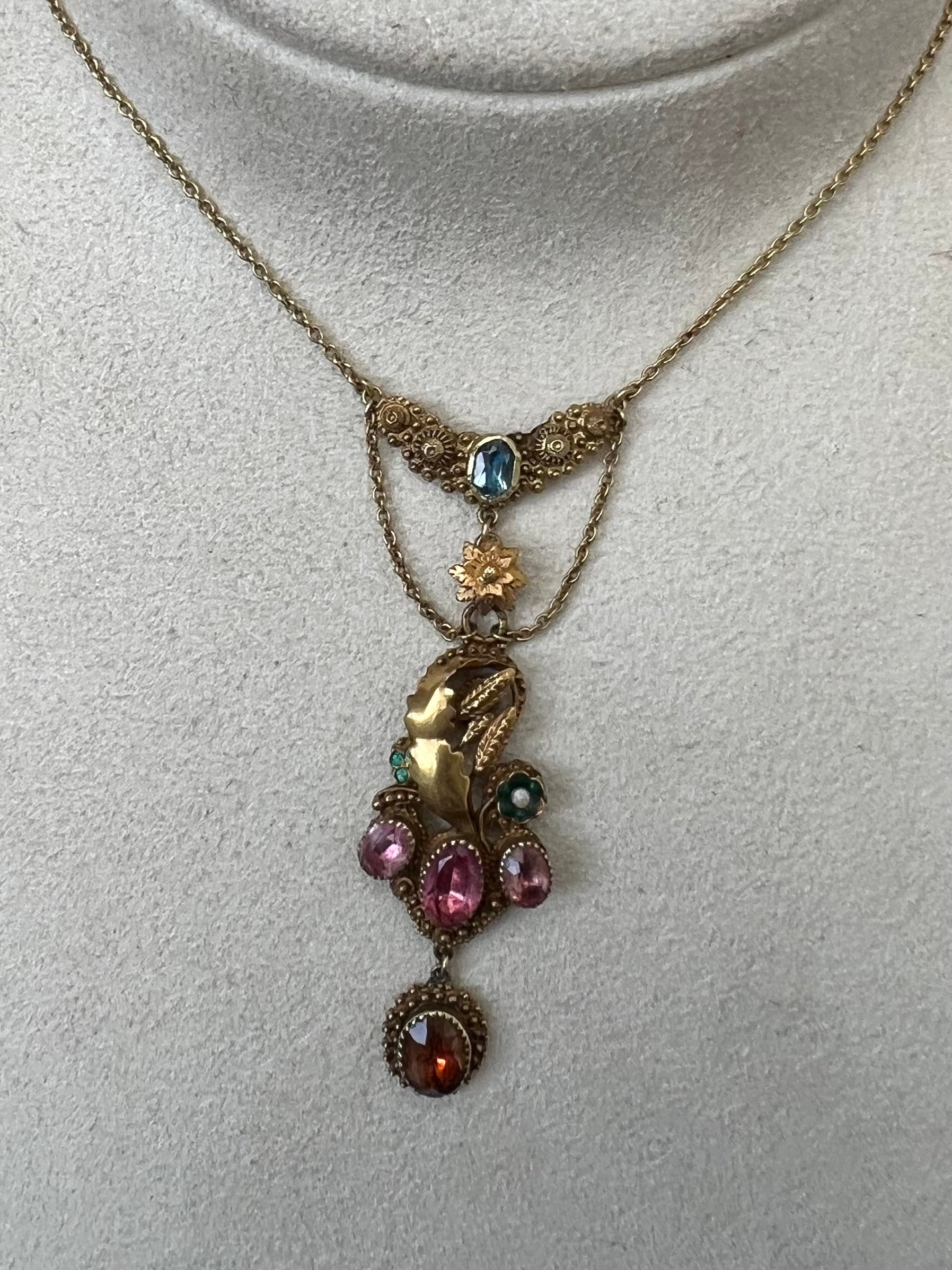Description: A very old, very beautiful hand made necklace. It has a provincial feel to it, its been professionally made but we think by a small, working jeweller sometime in the mid to late 18th century. We always called this one "the farmers wife's necklace" as it has flowers and corn cobs amongst the most delicate gold work - there's certainly a lot of symbolism here that you could have fun deciphering!