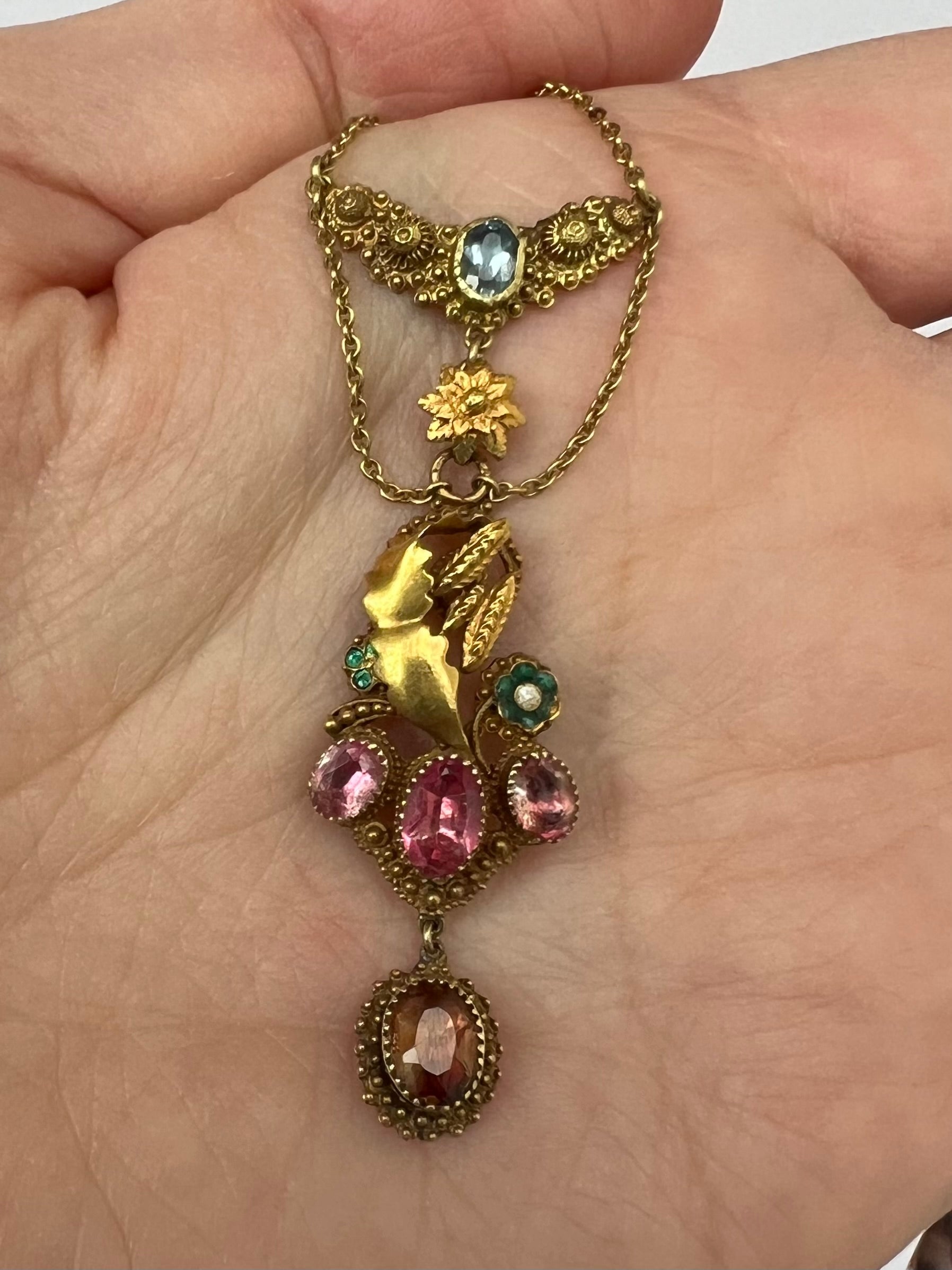 Condition: Very good for its age and very wearable. The gold back on the largest pink stone has worn away leaving the metal foil exposed, this does not affect the appearance from the front at all. The bottom drop has lost half the gold backing and this has created a slightly mottled effect when viewed from the front - nothing that spoils the look. the central leaf motif may appear to be bent at the top but on closer inspection it appears to be attached at the top (behind the corn) so looks to have always been this way. Typically Georgian engraved square clasp works great.