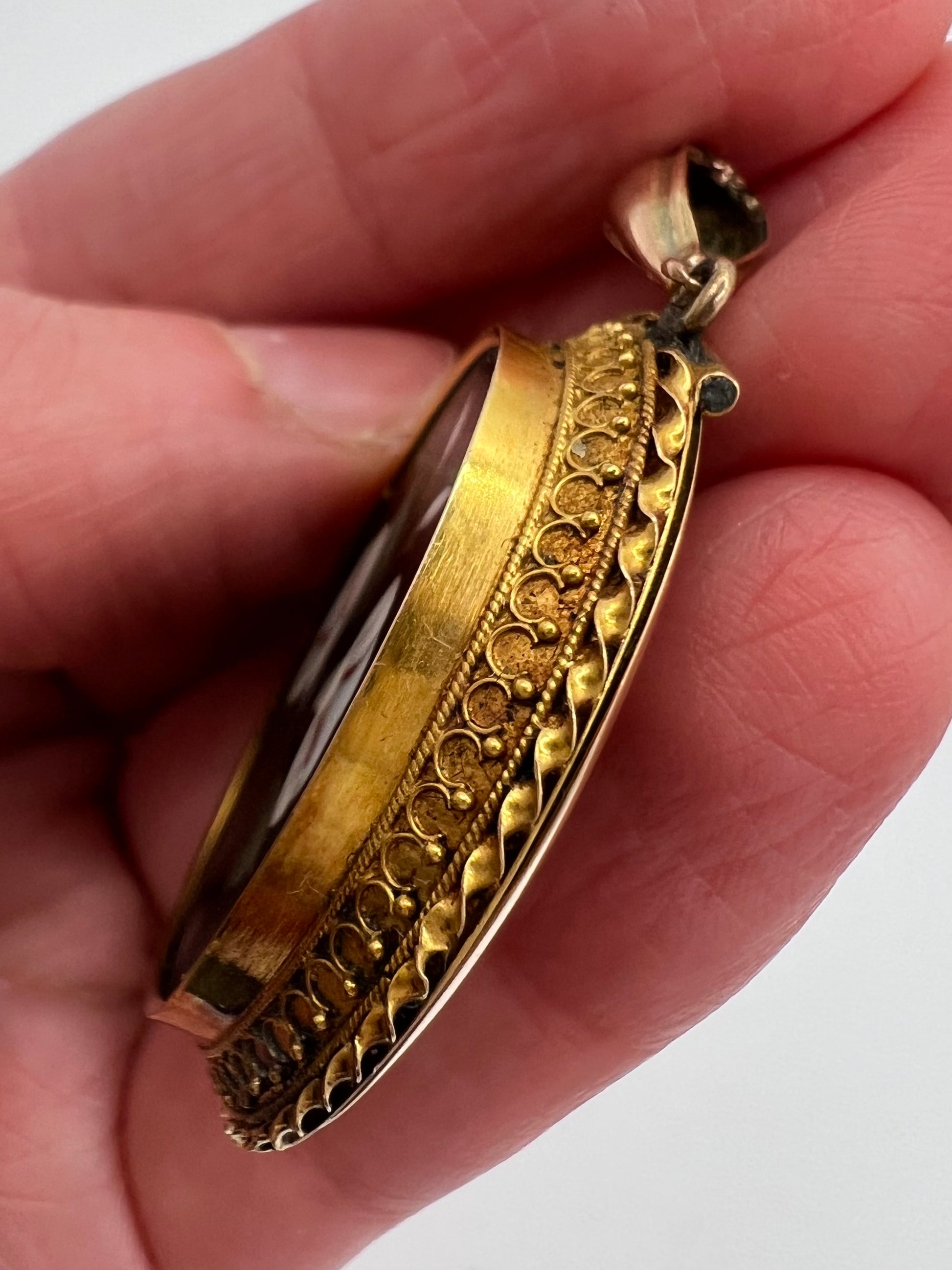 Description: A beautiful quality pietra dura (Italian for hard stone) locket pendant. The pietra dura work is very fine with each element made up of small pieces of different coloured natural stone laid into a black, Belgian slate base (can you imagine the time and skill required!). The outer gold frame is just as good with hundreds of little gold Etruscan revival elements which have all been made and attached by hand. It would be just about impossible to have this sort of thing made today and if you could you'd be paying skilled artisans a lot of money!