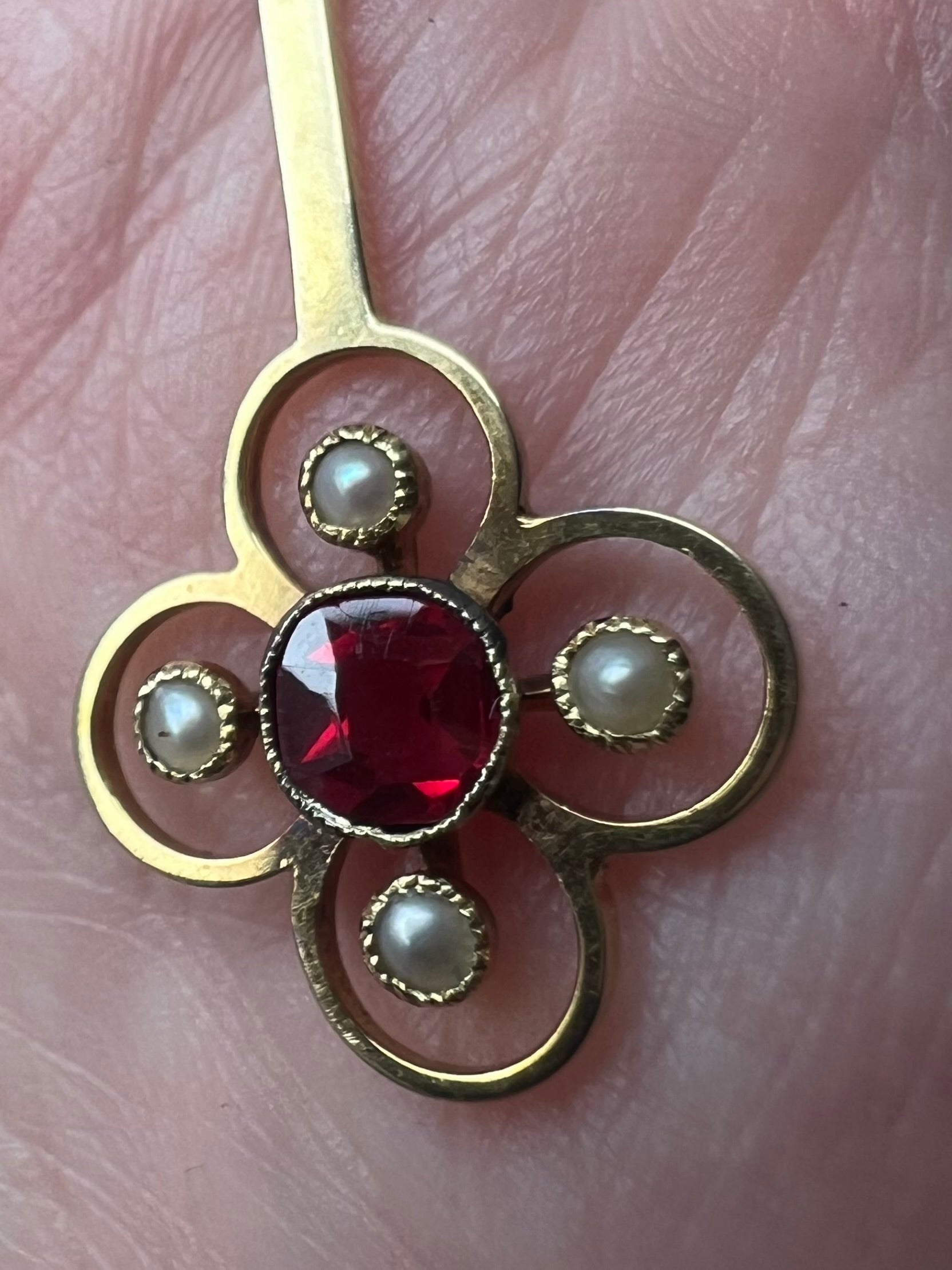 Edwardian 15ct Gold Quatrefoil Garnet Seed Pearl Necklace
