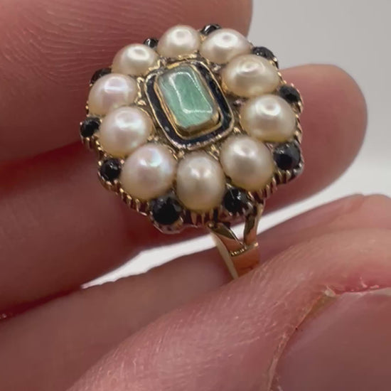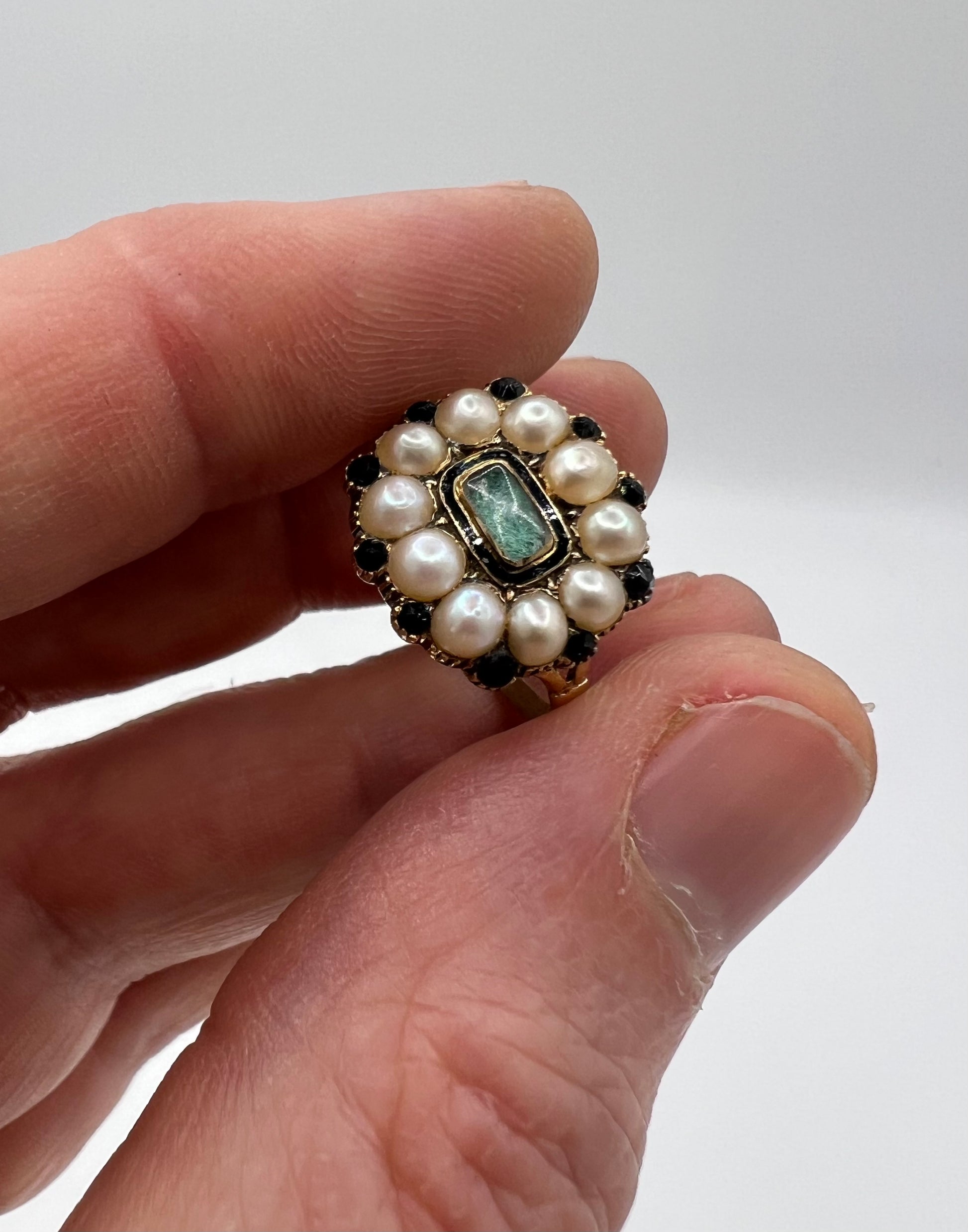 Description: At first glance a Georgian pearl and emerald ring - Well its certainly Georgian but we think that the green centre stone is a rock crystal quartz that has been foiled to make it look green - very clever!