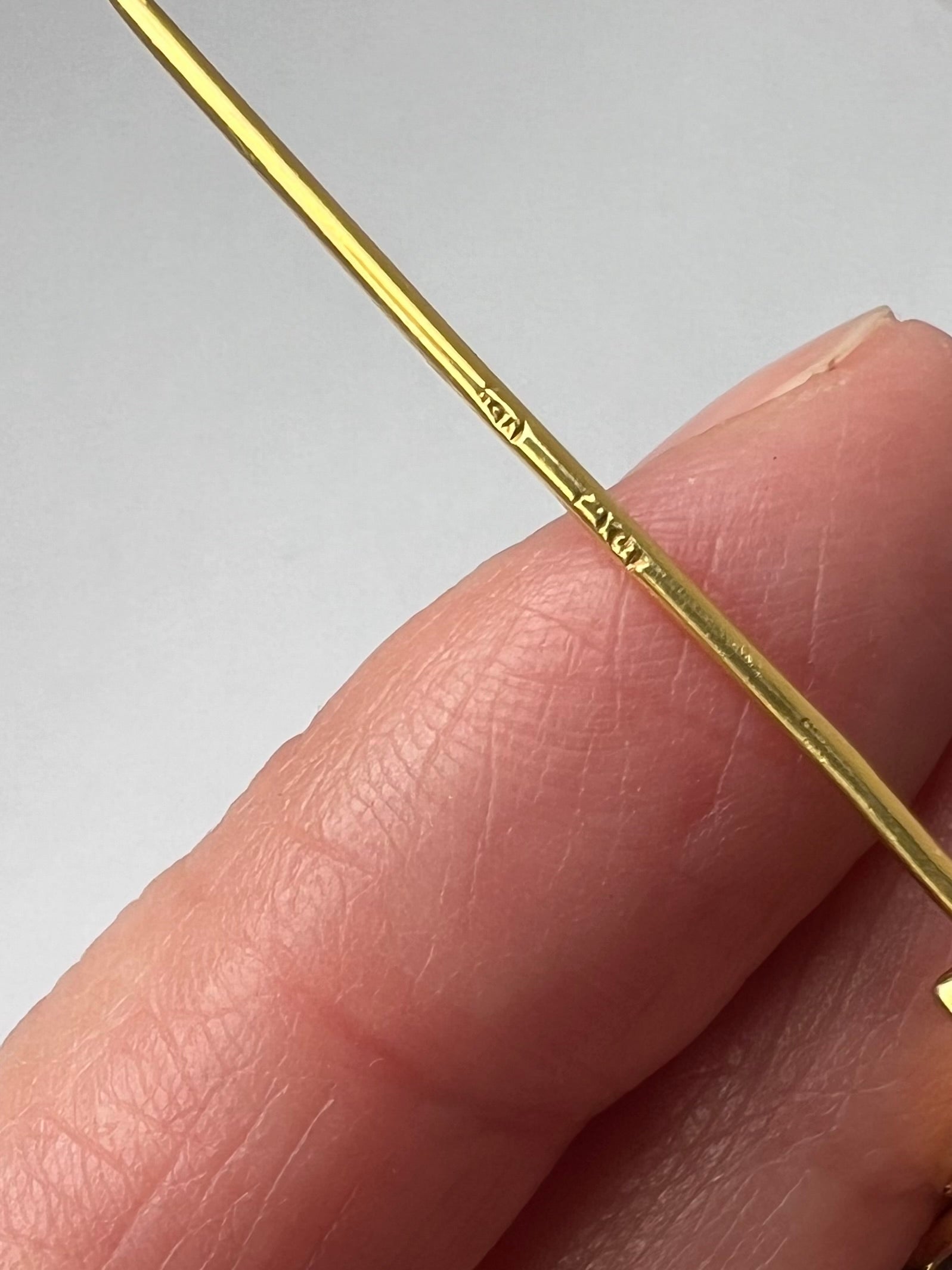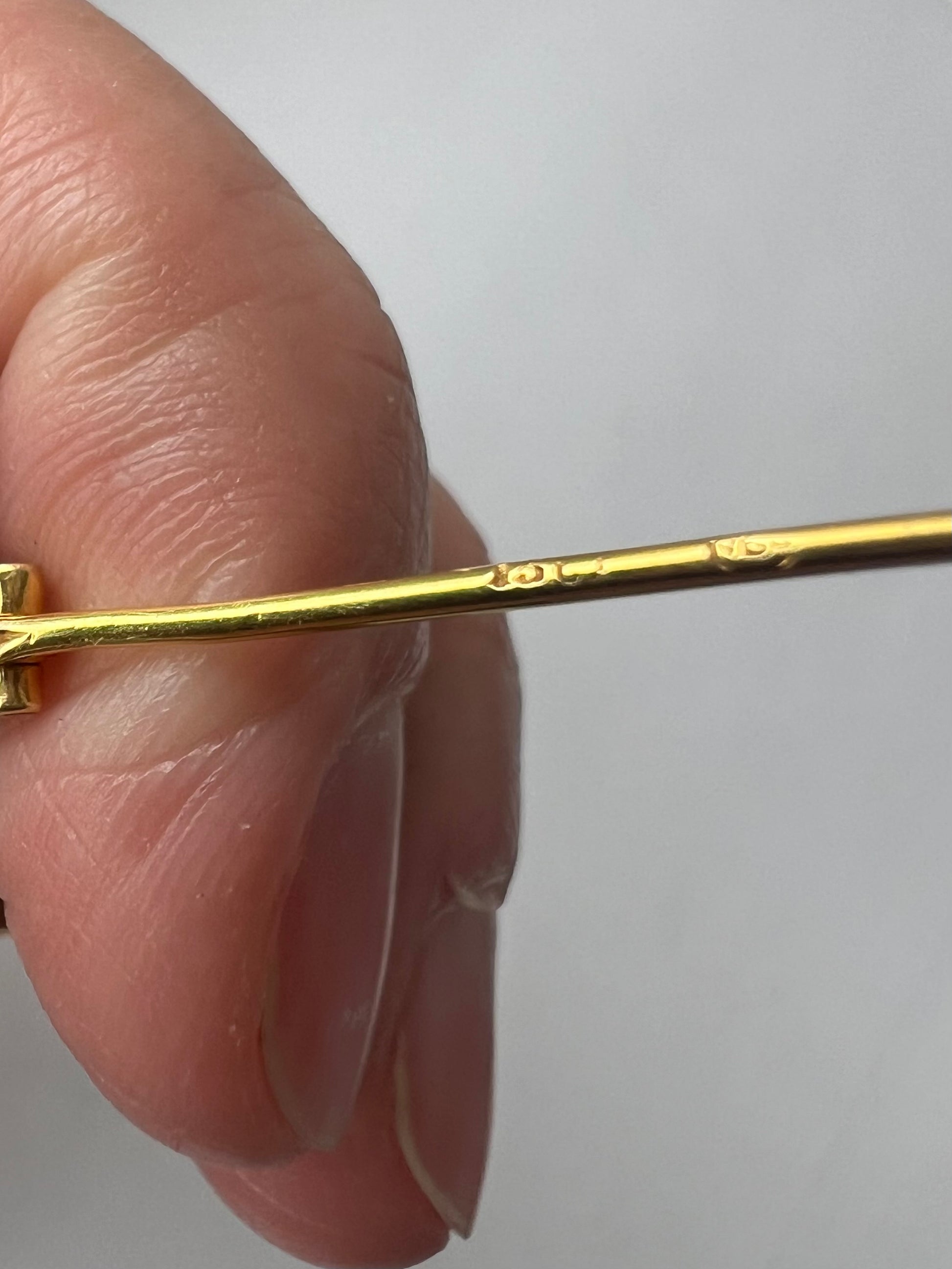 Description: Likely retiled by Liberty, a typical art nouveau, arts and crafts brooch (with possibly later applied gold pendant bale). The oval MB mark on the pin is too worn to see properly and there's also the remnants of a 15ct mark.