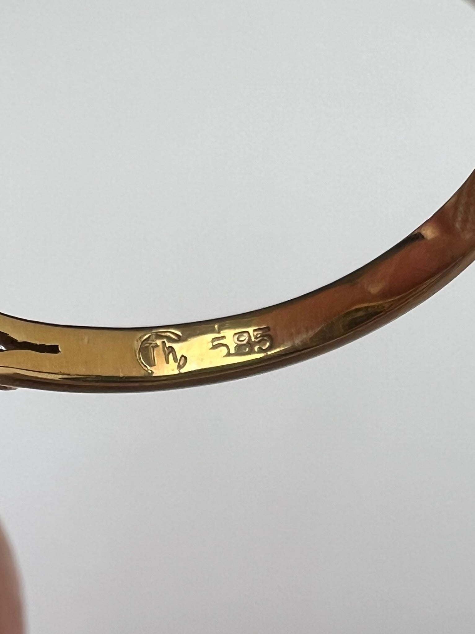 Description: A stunning arts and crafts ring. We're scratching our heads a little with this one! Firstly we've been unable to turn up anything on the maker - the letters "th" inside a "C" also, stylistically its undoubtedly arts and crafts but doesn't fit the "handwriting" of anyone we know. Its 14k gold so this all leads us to the thought that it may be American. We'd welcome any suggestions though!
