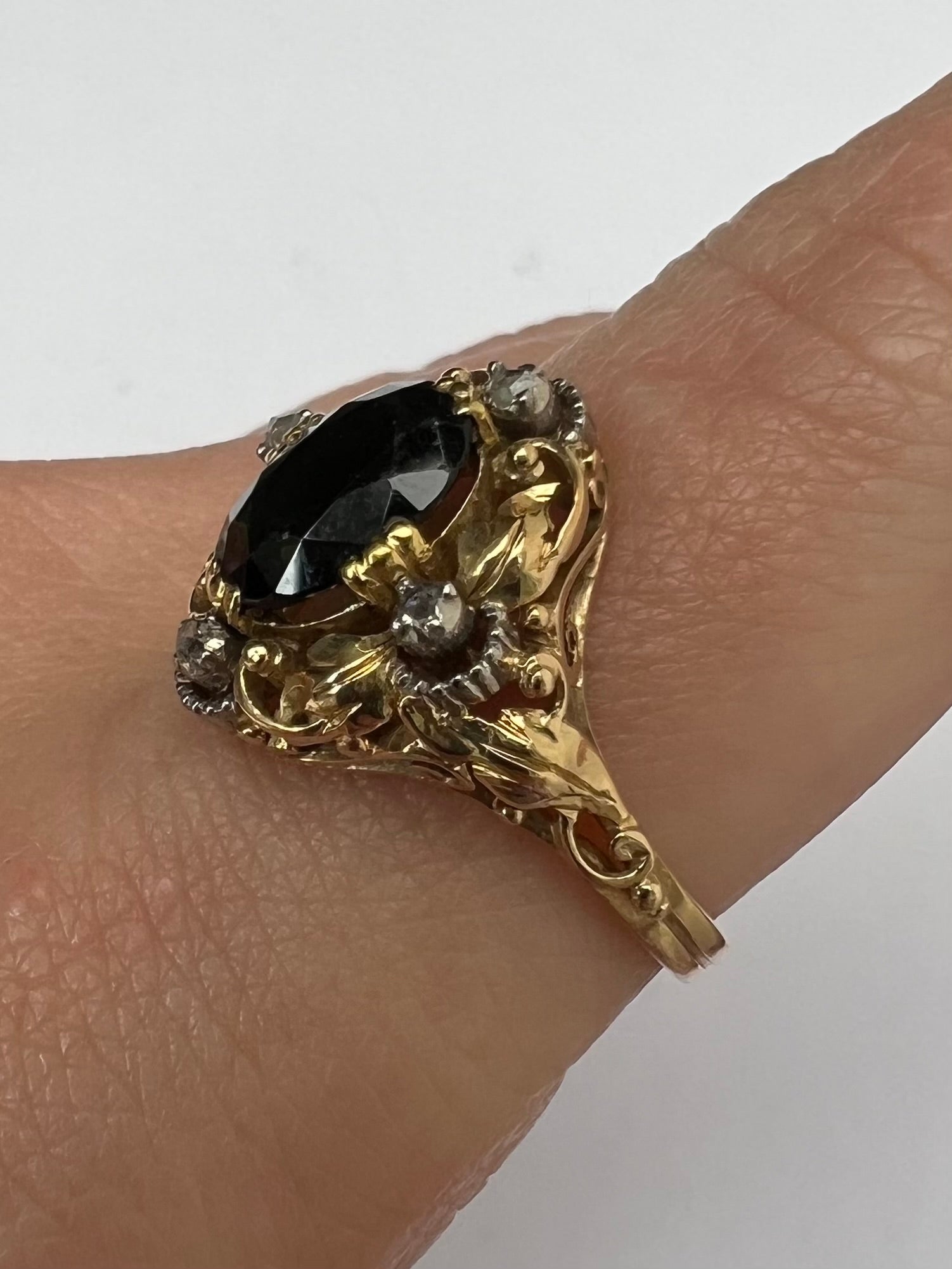 Materials: 14ct yellow gold (with white gold accents), Green tourmaline, rose cut diamonds