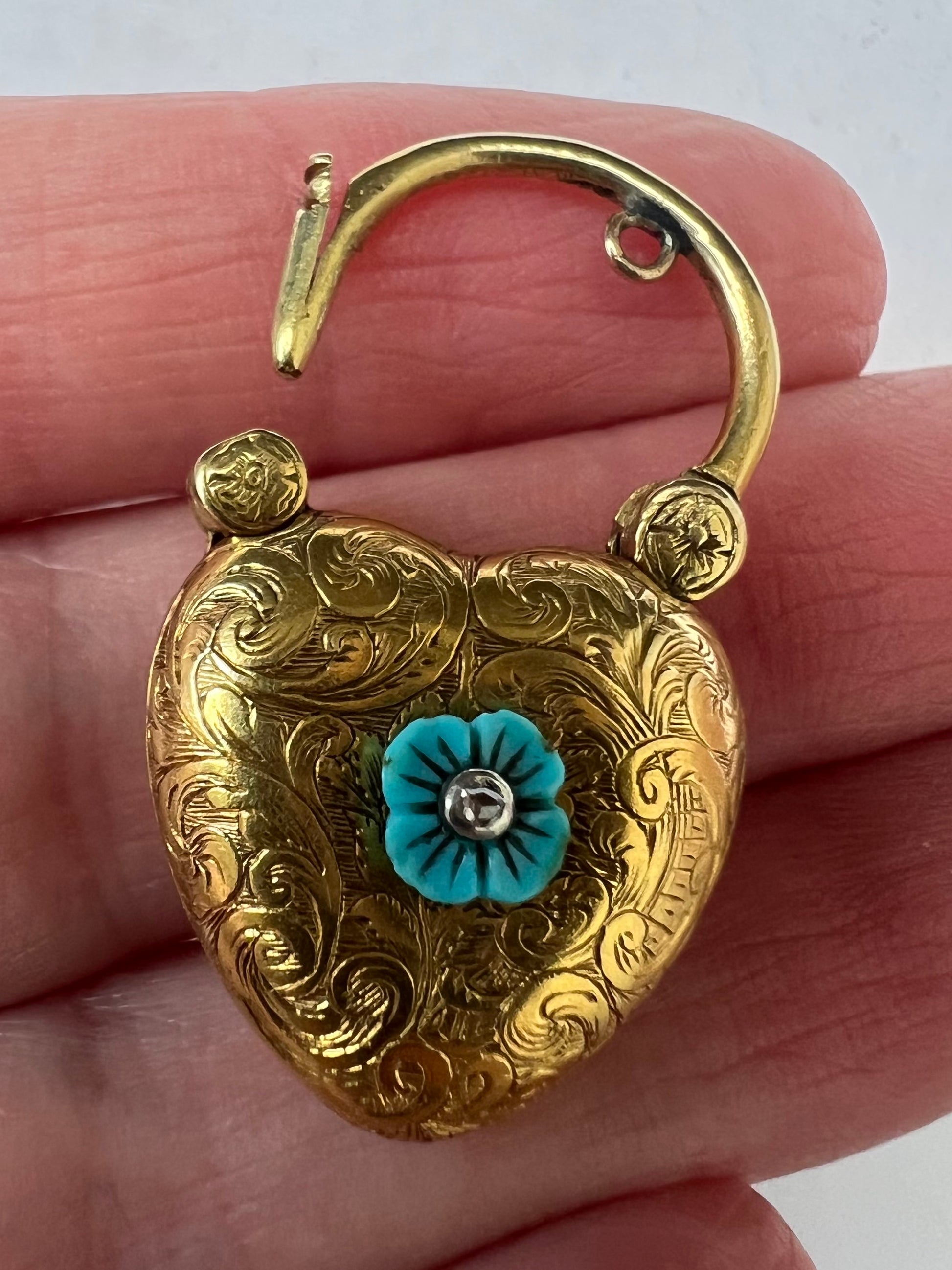 Description: Fabulous quality thing - all made by hand (and hand chased all over, even inside) over 150 years ago! Lovely antique keepsake with the turquoise flower representing a forget-me-not and the little diamond signifying eternity/eternal love. So a really sweet and powerful little love token. It could have carried a picture of a loved one inside and most likely a lock of hair. The locket does not open until the top is opened up. Would originally have been on bracelet and could be again or makes a fab, romantic pendant.