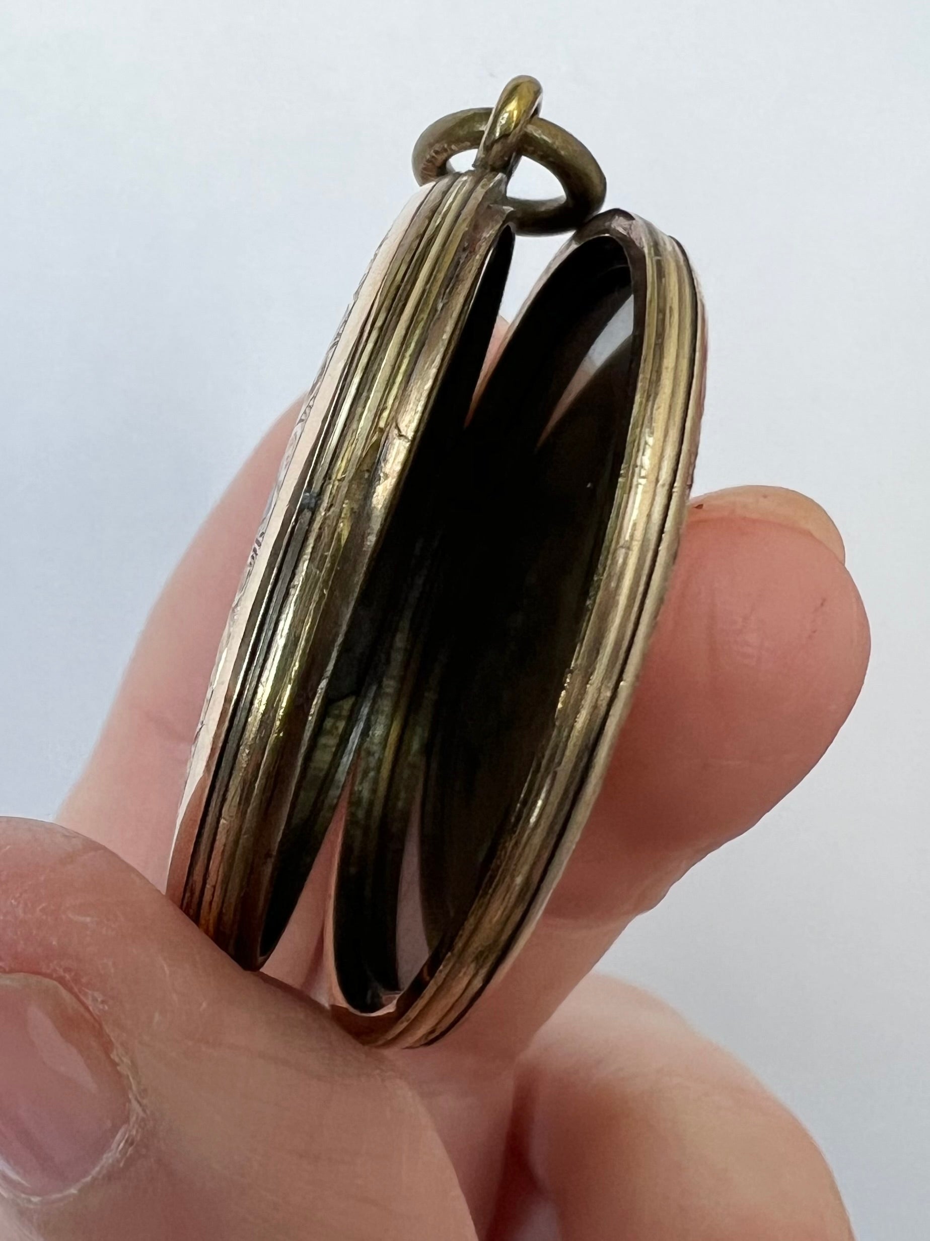 Materials: 9ct gold back and front, some of the body of the locket is metal and the top loop is gold plated