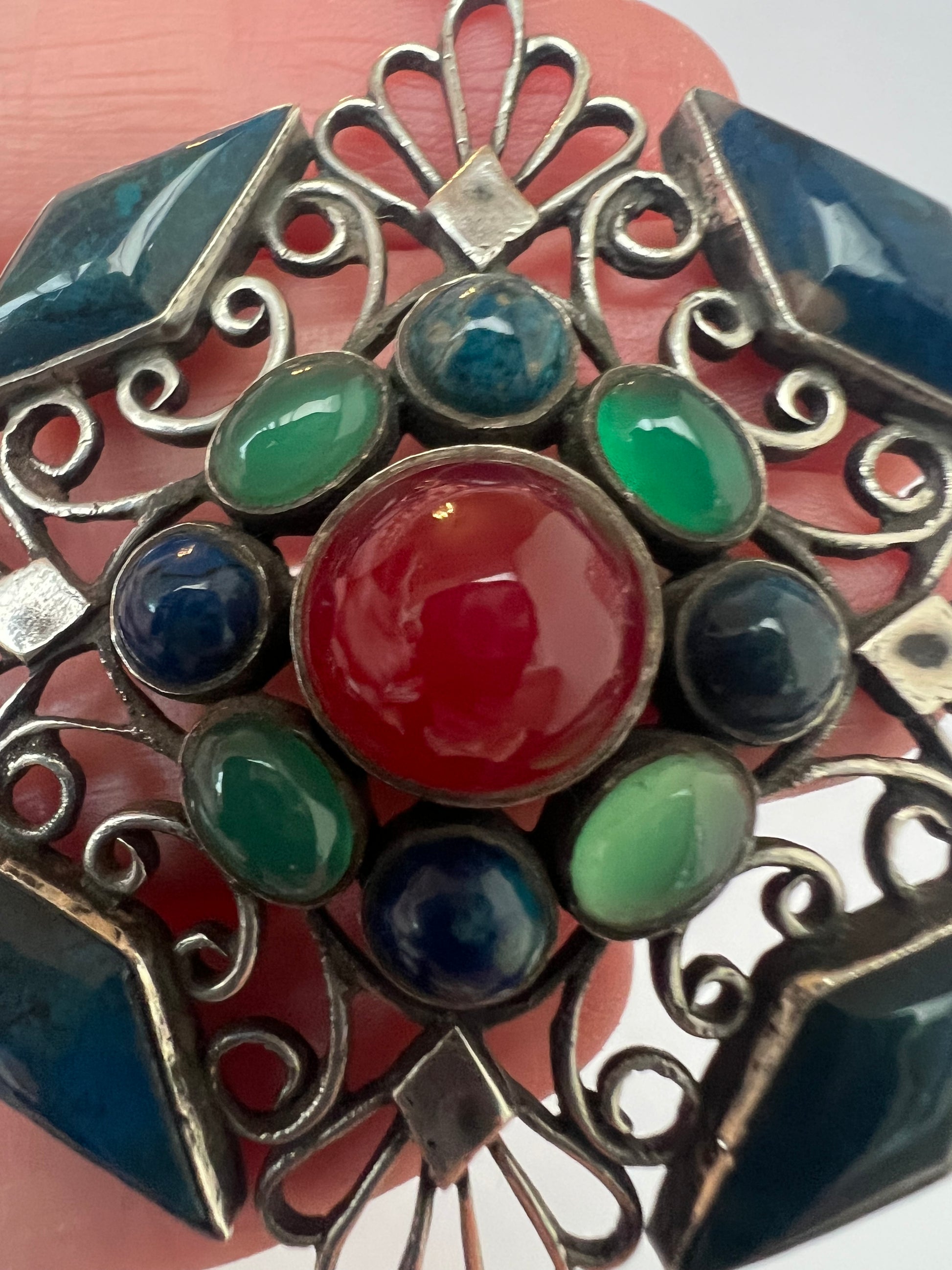 Materials: Silver, chrysoprase, blue agate, as yet unidentified red cabochon (very nice very high dome)