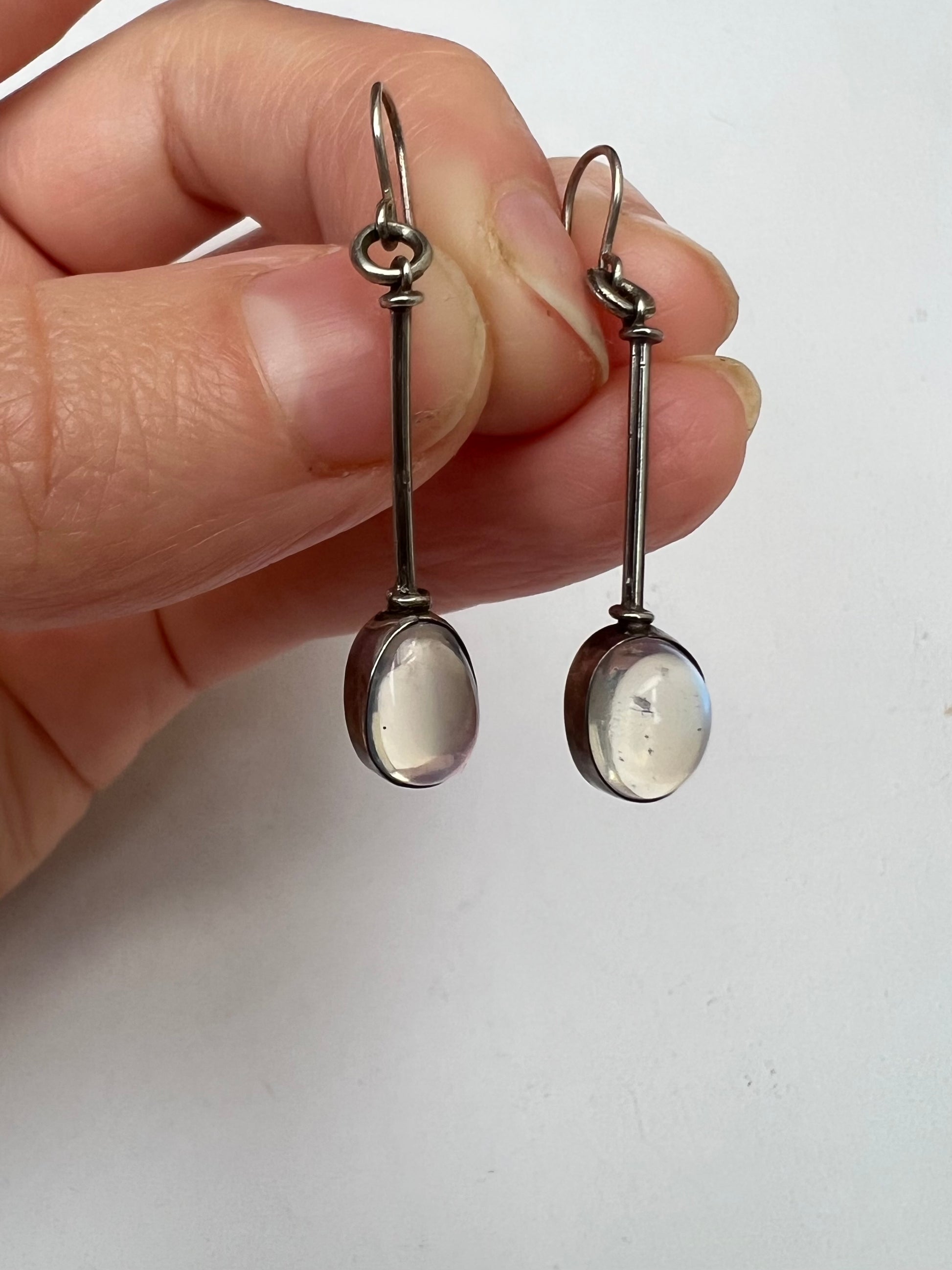 Description: The most elegant pair of arts and crafts earrings. Very plain, very simple and so delicate. The moonstones have a fabulous blue schiller and although they may look very simple, it takes a lot of skill to pull of something like this!