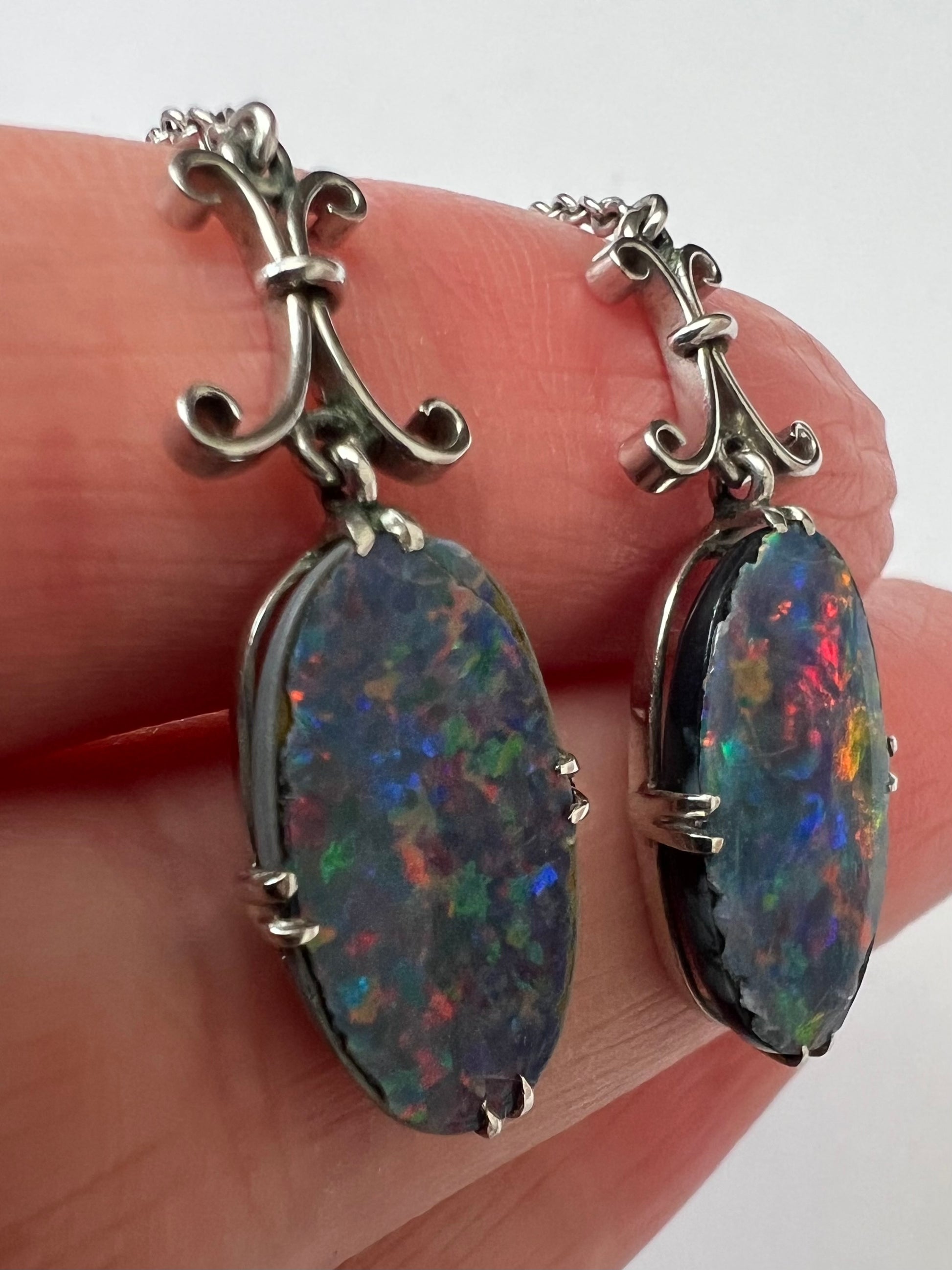 Description: Lovely early 20th century white gold and opal doublet earrings. The opals are alive with colour, green, blue, purple, orange and red, the rarest and most prized hue all against a black background. Doublets are thin slices of precious opal backed with either the host boulder or another material.