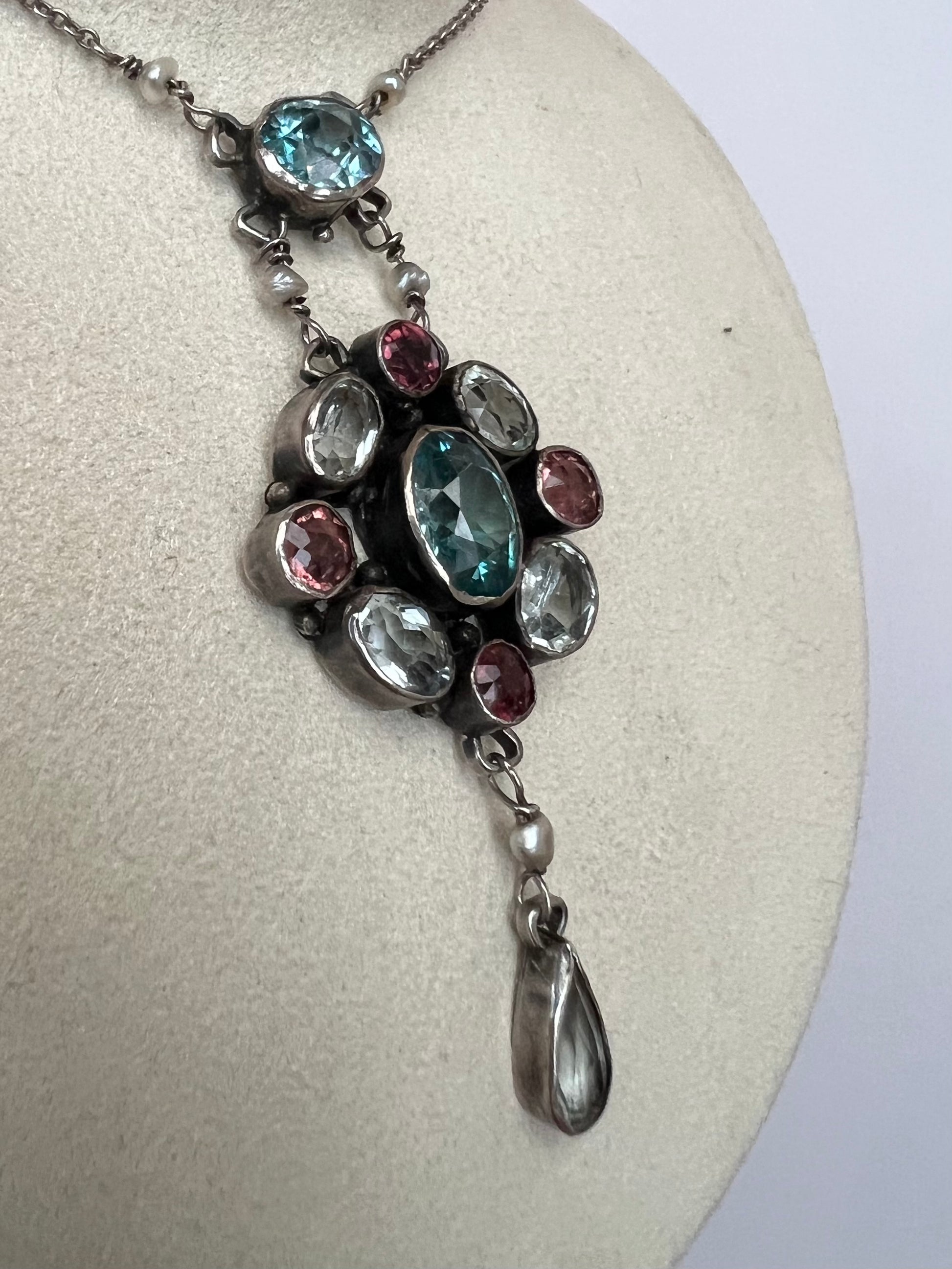 Pink Tourmaline Blue Zircon Rock Crystal Arts & Crafts Silver Pendant. Reserved, please enquire