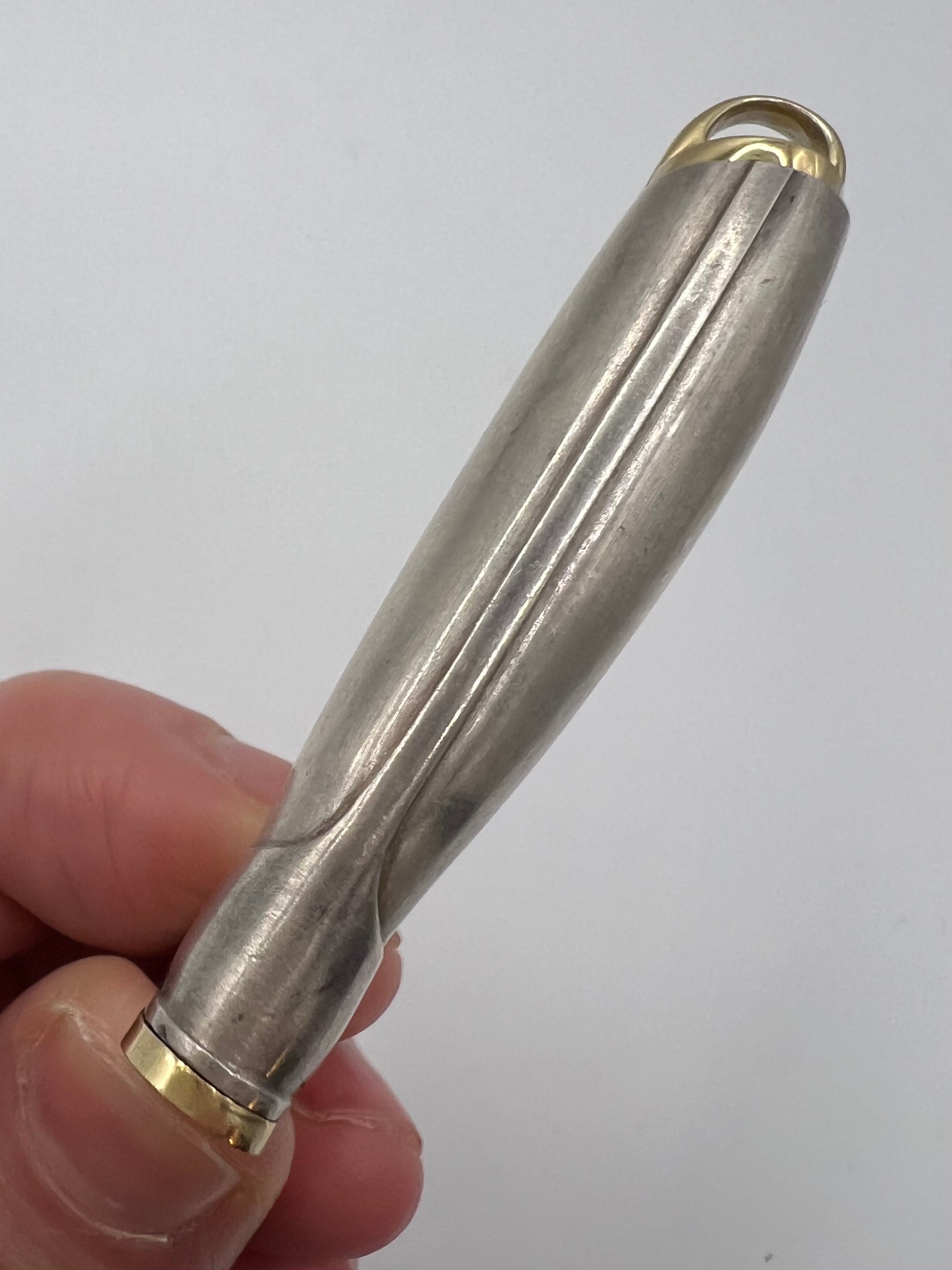 Description: An intriguing little item made by Hermes, Paris. As far as we can see this is 1 of 1 and must have been made by Hermes as a commission for a private client - our research has turned up nothing and Hermes heritage department were difficult to pin down and not really interested in helping out it has to be said! It is such a classy item, the boot is modelled so perfectly as the classic Hermes riding boot and its wonderfully asymmetric right down to the slanted top holding the18ct gold shoe tree pendant. What is it for? We don't know! The top part (which allows it to act as a pendant) and the heel piece are made of solid 18ct gold, the top is removable and the heel slides to the side (please read below re condition). So it's obviously a container of some sort and perhaps was made to hold and discreetly dispense an illicit substance!? We really don't know, if you do, please tell us!