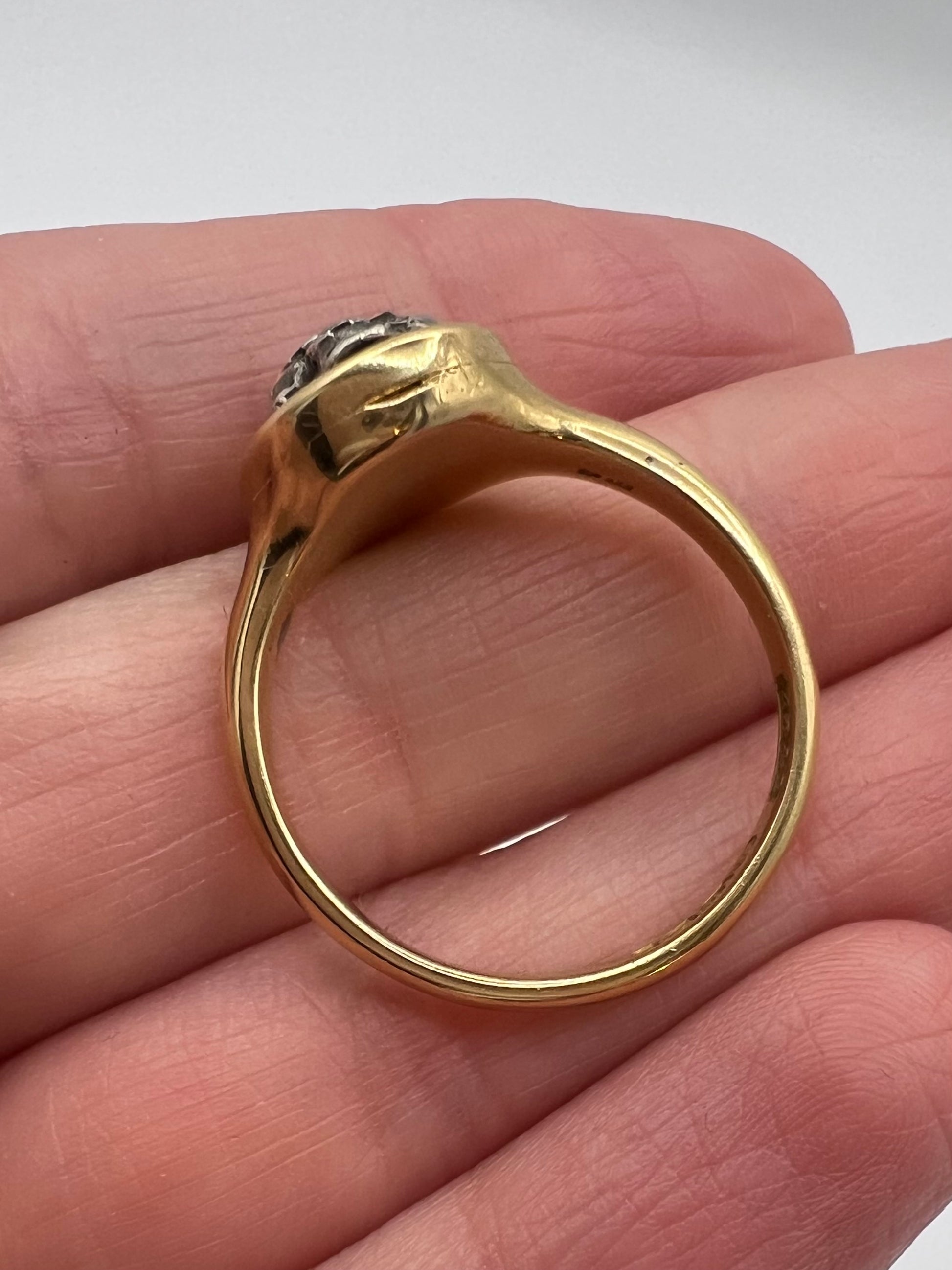 Description: Super ring, very heavy, smooth and tactile and with a beautiful "Memento Mori" diamond and silver skull. This ring also holds a secret - it opens to reveal a small compartment, perfect for smuggling governmental secrets, magic potions or a dose of poison intended to harm a rival. Ok not really, it was probably originally a locket compartment to hold a lock of hair or a small keepsake. The hinge is almost invisible and the whole thing is beautifully constructed. Memento Mori motifs were often used in jewellery to remind the wearer that life is fleeting and should be respected and lived to the full - a sentiment that still resonates today.