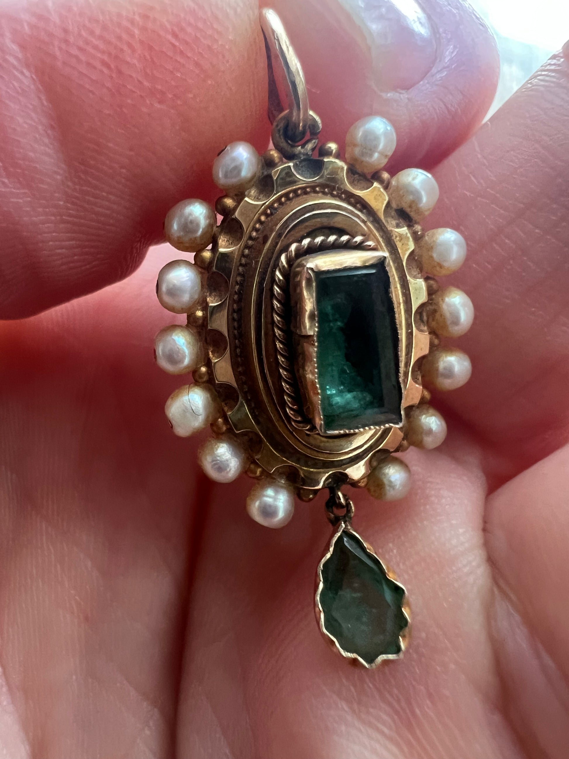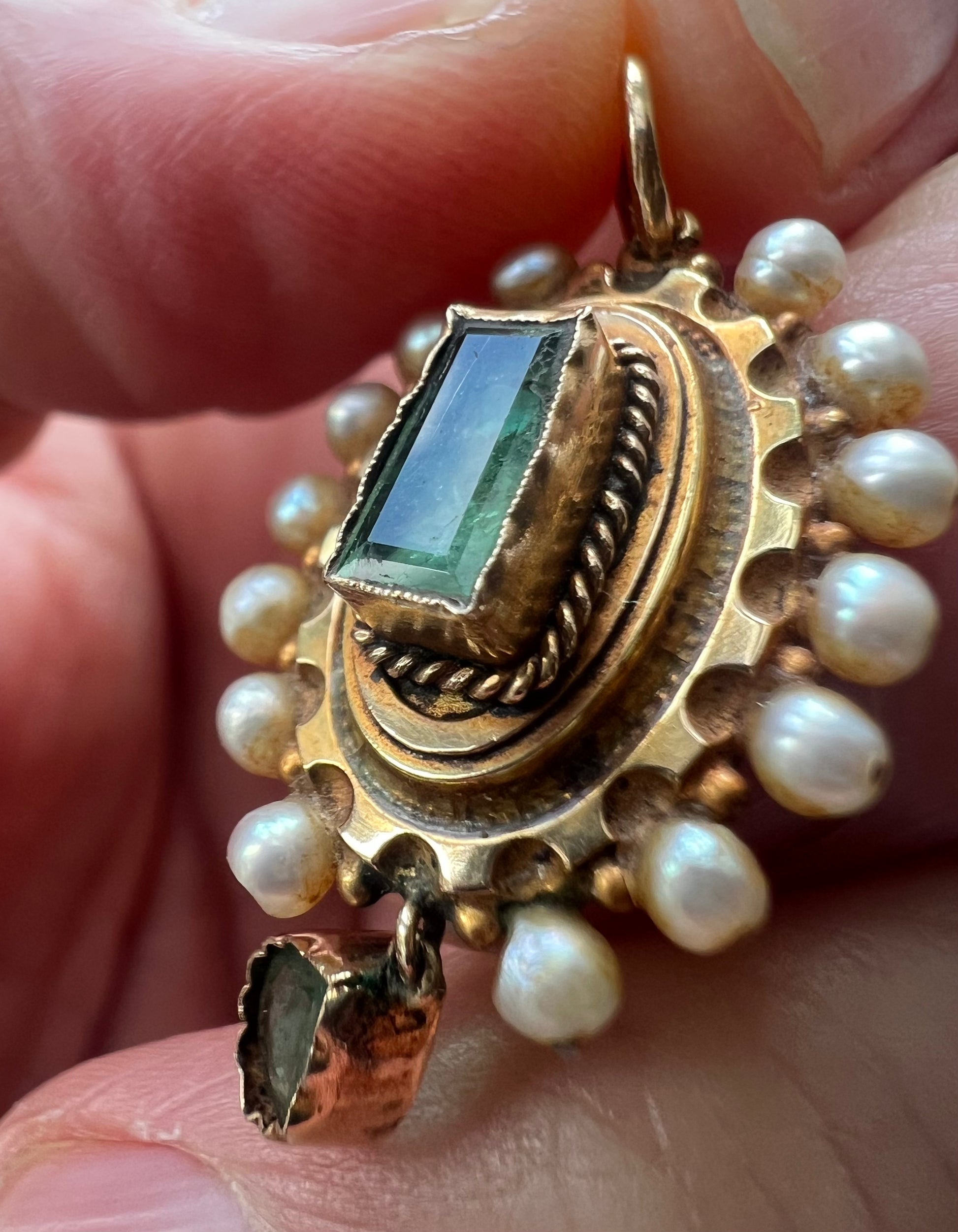 Spanish or Portuguese Emerald Pearl Gold Victorian Pendant