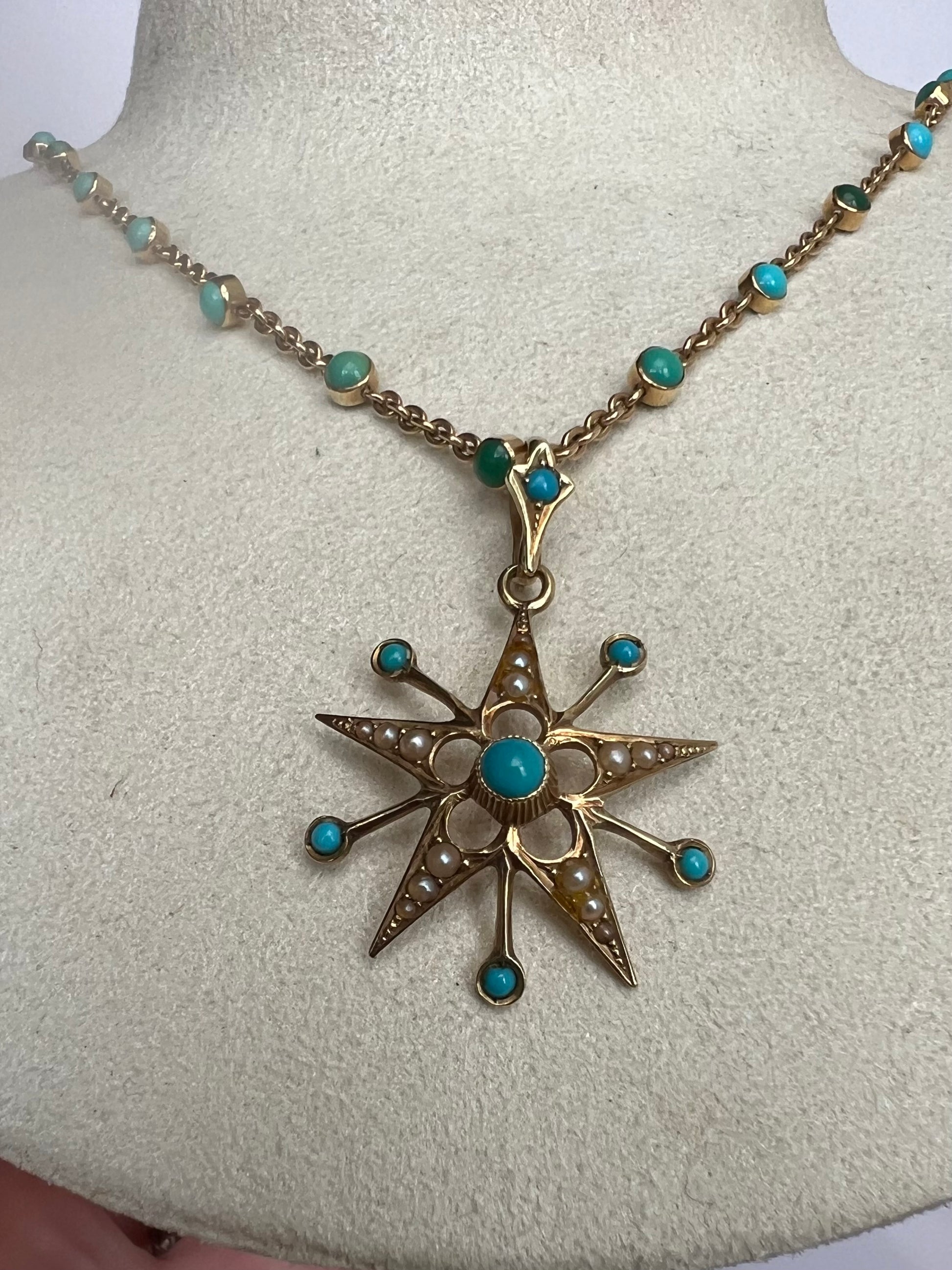 15ct Gold Fancy Turquoise Chain and Turquoise Pearl Star Pendant